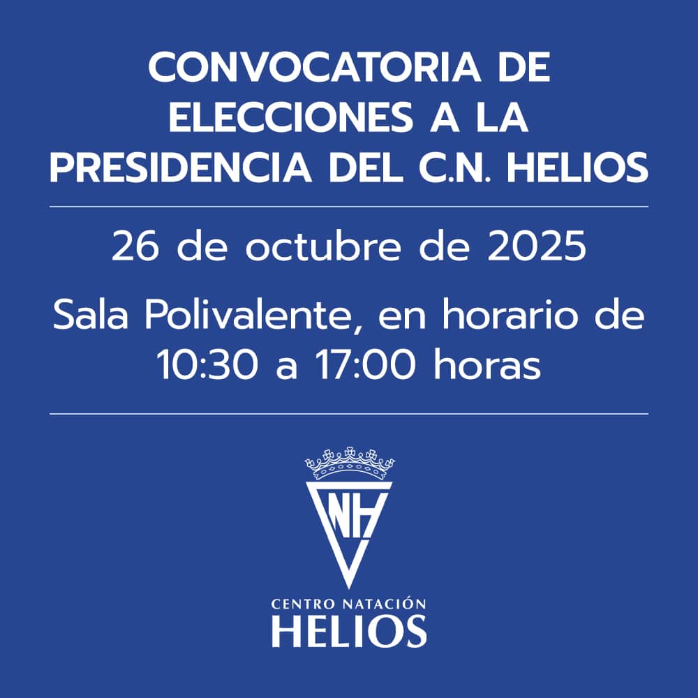 Convocatoria de elecciones a la Presidencia del Centro Natación Helios 2025 El próximo domingo, 26 de octubre de 2025, se celebrarán en el Centro Natación